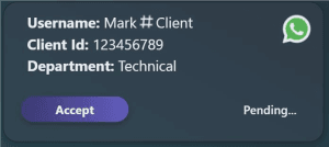 The new ticket contains the customer’s chosen username, their client identifier (Client Id), the department they have been redirected to, the platform they used to open the ticket, the current ticket status and the Accept button. A ticket can be accepted if the status of the ticket is Pending.